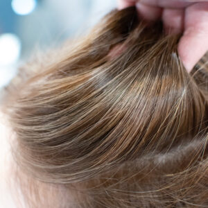 細目ハイライトで根元から明るい線を入れます。白髪の状態を見ながらベストな薬剤で慎重に施術します。